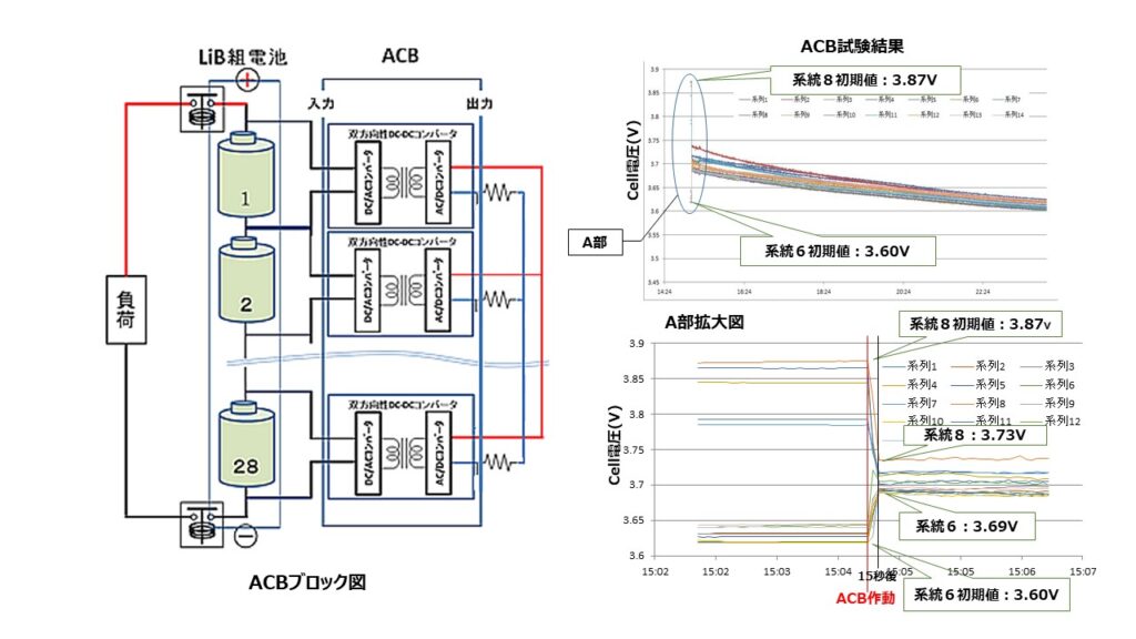 出口側の電圧が自動的に平衡になるよう作用するので、出口電圧が高いほうから低い電圧のCellへ電流が流れ、容量のバラツキを是正する仕組みです。 この作用は、LiB組電池の運転中、常に動作しますが、 容量バラツキがある一定範囲内に収まれば停止します。